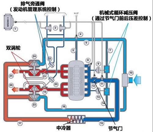 低轉(zhuǎn)速或者怠速的時候,排氣旁通閥完全關(guān)閉,所有的廢氣通過兩個輕質(zhì)小渦輪,獲得最大的增壓效果,提高低轉(zhuǎn)速下油門響應(yīng)性以及動力輸出;在發(fā)動機滿負荷的情況下,通過部分打開排氣旁通閥以獲得一個比較恒定的增壓壓力,不增加耗油量。