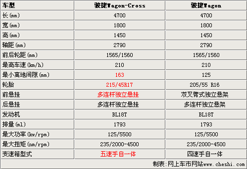 新駿捷WagonCross與駿捷Wagon的車身尺寸基本沒有變化,長(zhǎng)寬高分別是4700/1800/1450毫米,軸距和前后輪距也沒有變化。但新駿捷WagonCross加大了離地間隙,達(dá)到了163毫米。另外,新駿捷WagonCross配備的是17英寸輪胎,而駿捷Wagon則配備16英寸輪胎。新駿捷WagonCross采用前后多連桿式設(shè)計(jì),駿捷Wagon則采用雙叉臂式獨(dú)立懸架。在動(dòng)力方面,這兩款車并沒有太大差別,只不過新駿捷WagonCross采用五速手自一體變速器,比老款駿捷Wagon有很大提高。