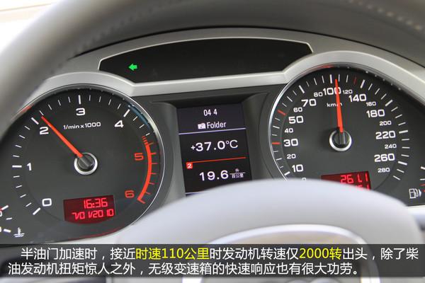 人多車多,廣州特色,都城已經(jīng)成為廣州人生活的一部分。面的蠕動(dòng)似的前進(jìn),發(fā)動(dòng)機(jī)轉(zhuǎn)速僅比怠速高一點(diǎn)點(diǎn)即可驅(qū)動(dòng)車輛前進(jìn)(約1200轉(zhuǎn)/分鐘),能把轉(zhuǎn)速控制在如此低的水平,正是柴油發(fā)動(dòng)機(jī)低速大扭矩的體現(xiàn)。但在這樣的環(huán)境中,并沒多少機(jī)會(huì)能給渦輪增壓系統(tǒng)發(fā)揮,渦輪打開的轉(zhuǎn)速為1400轉(zhuǎn)/分鐘,憋屈著。由于轉(zhuǎn)速較低,加上奧迪出色的隔音做工,車內(nèi)非常安靜,聽著BOSE音響美妙的樂章,就算路上再堵也能保持心情舒暢。