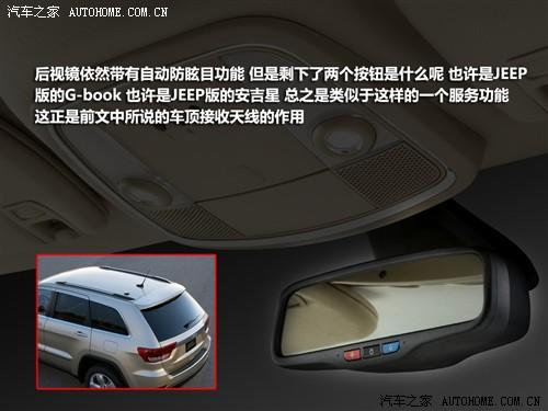 車(chē)內(nèi)反光鏡上有三個(gè)按鈕,中間的為自動(dòng)防眩目的開(kāi)關(guān),那另外兩個(gè)是什么呢,或許是JEEP的“G-book”,或許是JEEP的“安吉星”,總之我們猜測(cè)就是類(lèi)似于這兩個(gè)系統(tǒng)的一種服務(wù)功能,而上文提到的車(chē)頂天線(xiàn)應(yīng)該就是該系統(tǒng)的接收模塊吧。