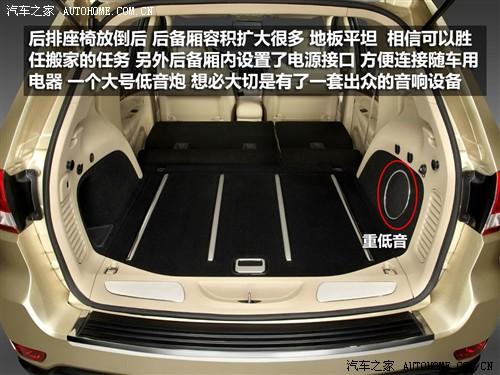座椅放倒后空間后備廂空間得到很大擴(kuò)大,放倒后地板平整,我想可以勝任搬家的任務(wù),如果用作旅行,后備廂容積足以放下你所需的物品,不是還有車(chē)頂行李架呢嘛?后備廂還這是了一個(gè)電源接口,方便隨車(chē)用電器連接使用。另外在后備廂內(nèi)發(fā)現(xiàn)了一個(gè)尺寸不小的低音炮,相信新款大切可以給我們帶來(lái)不錯(cuò)的視聽(tīng)感受。