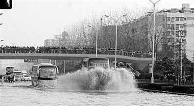 7月13日,網(wǎng)友復(fù)古魚在得意網(wǎng)發(fā)出了名為《在武漢不會開飛機的船長不是好司機》的帖子,其中附上了三張圖從不同角度反映了公交車司機“瘋狂”的一面,第一張圖中一輛公交車飛馳而過,前輪離地約30厘米,網(wǎng)友看后驚呼“果然飛起來了!”;第二張圖中公交車如同船一樣趟深水而過,大量水花濺離地面約2、3米;第三張更是“雷”人,一約六旬太婆被夾在兩公交車間正在痛苦的“跳車”,而她身下則是已沒過車輪胎的深水。
