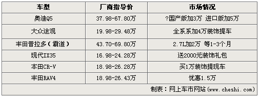 在文中提到的6款熱銷SUV車型中,加價賣車的情況似乎有所并沒有太多弱化的趨勢。加價幅度最大的是奧迪新晉高級SUV車型Q5,國產(chǎn)版車型全系加價3萬,進口版車型全系加價5萬。豐田召回風波的影響尚未煙消云散,旗下熱銷的SUV車型RAV4做出了1.5萬的讓利,與之前的加價形成了非常鮮明的對比。