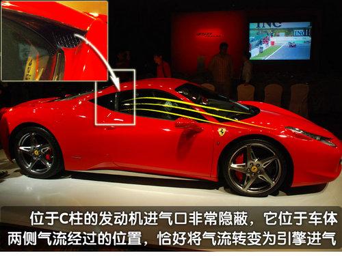 當(dāng)通過車身兩側(cè)的氣流經(jīng)過駕駛室后方的C柱時候,隱藏在C柱內(nèi)部的引擎進氣口恰好在這里等待著新鮮的空氣。通過位于C柱內(nèi)的引擎進氣口,發(fā)動機將獲得充足的新鮮空氣,并且法拉利的工程師還告訴我們:當(dāng)車輛的時速達到100公里/小時開始,由于氣流經(jīng)進氣口以及進氣道所產(chǎn)生的“動態(tài)增壓”效應(yīng),會使發(fā)動機的功率額外增加5馬力,最終實現(xiàn)570匹馬力的最大功率。