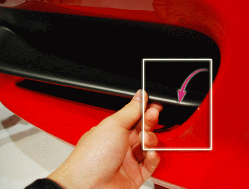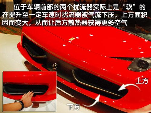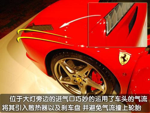 轉(zhuǎn)到車頭的上方您會發(fā)現(xiàn)在458Italia的大燈一側(cè)會有一個隱藏的通風(fēng)口,這里的設(shè)計能夠讓從車頭過來的氣流在經(jīng)過這里的時候進入通風(fēng)口,使其變?yōu)橐嫔崞饕约扒拜唲x車系統(tǒng)的冷卻氣流,類似這樣的巧妙設(shè)計還有很多。