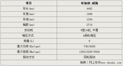 布加迪威龍(VEYRON)這個(gè)名字源自曾經(jīng)駕駛布加迪57贏得1939利曼桂冠的Pierre Veyron。而16.4代表16個(gè)氣缸和4個(gè)渦輪增壓器。 這款車配備了大眾專門研發(fā)的W型16缸發(fā)動(dòng)機(jī),可以說是將兩臺(tái)V8發(fā)動(dòng)機(jī)公用一根曲軸的產(chǎn)物。此外,該發(fā)動(dòng)機(jī)還配備了4個(gè)渦輪增壓器。排量達(dá)到了7993cc?梢员虐l(fā)出736千瓦的最大功率,同時(shí)在極低的1000rpm時(shí)即可輸出730牛米的龐大扭矩,在2200rpm時(shí)就可以迸發(fā)出1250牛米的峰值扭矩,這種扭力會(huì)一直持續(xù)到5500rpm。
