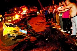 前晚11點(diǎn)半,凱宴仍“躺”在河中,其4個(gè)車門緊閉,在岸邊看不清楚車內(nèi)情況。被撞羚羊車及出租車的司機(jī)分別被卡在車內(nèi),無法動(dòng)彈。