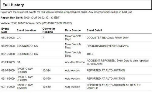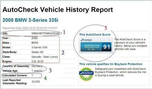 AutoCheck report與美國部份州的監(jiān)理所(DMV)有合作關系,因此如果您上美國監(jiān)理所(DMV)的網(wǎng)站,監(jiān)理所都會建議您在買車的時候,一定要檢查AutoCheck報告,在AutoCheck報告可能可以提供您買車的重要參考資料-如經(jīng)歷多少任車主,里程數(shù)為何,何時何地掛牌,是否有出過交通事故,車籍資料是否干凈(如Lemon car, Salvage or Junk title),等等歷史資料。另一份也一定要了解的是CarFax。