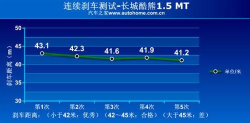 除了出色的乘坐和儲(chǔ)物空間,酷熊的動(dòng)力和經(jīng)濟(jì)性也有不錯(cuò)的表現(xiàn),從其連續(xù)制動(dòng)的工況圖中可以看出,酷熊的平均制動(dòng)距離在42米左右,且剎車系統(tǒng)的穩(wěn)定性也比較強(qiáng)。而在油耗測(cè)試中,6.7L/百公里的成績(jī)也低于我們的預(yù)期。