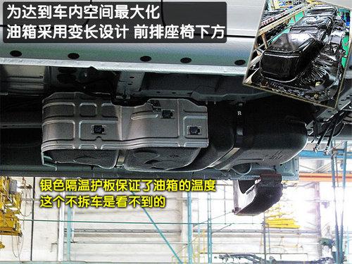 在總裝車間里我們發(fā)現(xiàn)了NV200的油箱,NV200為了更好的是車內(nèi)空間最大話,采用了扁平的油箱設(shè)計(jì),油箱位于前排座椅下。在油箱前側(cè)還發(fā)現(xiàn)了隔溫護(hù)板,以保證油箱的溫度。相比這個(gè)是不來生產(chǎn)車間是看不到的。