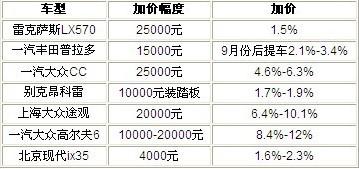 但是今年很奇怪,一邊是瘋狂降價,一邊部分車型的加價情況愈演愈烈,尤其在省外市場上,2010款路虎攬勝5.0車型的加價額度在18萬-20萬元,雷克薩斯GX460的加價額度為11萬,加價幅度幾乎占到了車價的10%以上,據(jù)說最高一個城市的加價比例為25%。
