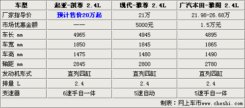 據(jù)北京地區(qū)進(jìn)口起亞4S店銷(xiāo)售人員透露,起亞的全新中級(jí)轎車(chē)凱尊與廣汽本田的雅閣一個(gè)級(jí)別,預(yù)計(jì)低配車(chē)型的售價(jià)在20萬(wàn)元起。目前4S店現(xiàn)已開(kāi)始接受預(yù)訂,訂金1萬(wàn)元,第一批車(chē)主將于8月底提到現(xiàn)車(chē)。同時(shí)從上表的數(shù)據(jù)看出,起亞凱尊的車(chē)身尺寸與同平臺(tái)現(xiàn)代雅尊和本田雅閣相比,是尺寸最大的,同時(shí)軸距也是三款車(chē)型中最長(zhǎng)的,這意味著它的車(chē)內(nèi)空間是最寬敞的。三款車(chē)型的發(fā)動(dòng)機(jī)形式都是直列四缸2.4L的發(fā)動(dòng)機(jī),變速器方面則是凱尊明顯占有優(yōu)勢(shì),配備的6速手自一體變速器。由以上數(shù)據(jù)看,如果起亞凱尊定價(jià)合理的話,上市后會(huì)有不錯(cuò)的成績(jī)。下面就讓我們提前去感受一下即將上市的起亞Cadenza凱尊。