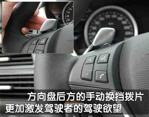 寶馬X6是其X系列中唯一標(biāo)準(zhǔn)配置帶換檔撥片方向盤的車型。由于換擋撥片集成在方向盤上,所以無論方向盤處于什么位置,駕駛者都可以用換檔撥片平滑而舒適地進(jìn)行升降檔。用方向盤上的多功能按鈕還可以快速操縱電話和音響系統(tǒng),使駕駛者將注意力集中于駕駛,駕駛者還可以根據(jù)個(gè)人偏好對(duì)方向盤上的兩個(gè)按鈕進(jìn)行單獨(dú)編程。