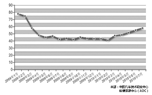 在產(chǎn)銷下滑的同時,庫存開始上升。7月份,汽車庫存周期逐月增長勢頭依然延續(xù),由6月份的55天增加到58天。其中,乘用車庫存周期由57天增加到60天,商用車庫存周期由49天增加到50天。