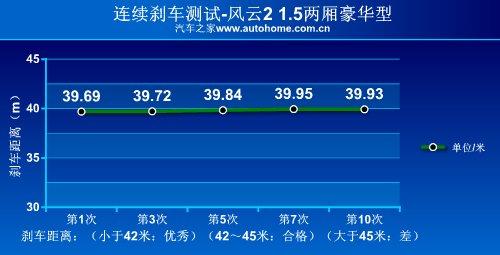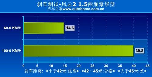 我們對風(fēng)云21.5L兩廂豪華型進(jìn)行的性能測試中顯示,從100KM/h全力制動到車輛靜止,剎車距離為39.8米,成績非常出色;剎車踏板回饋力較大,所以在剎車時需要使用更大力氣,在日常駕駛中踏板的余量偏大,不過一旦深踩,制動效果明顯。