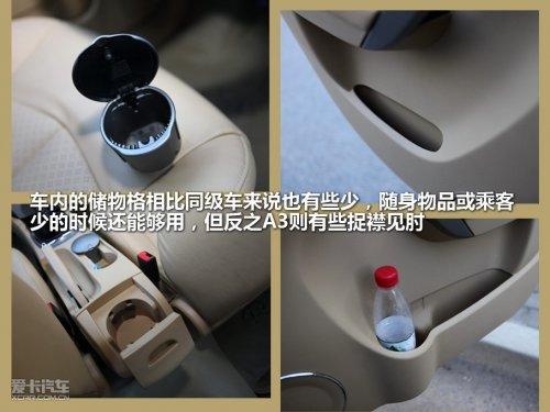 車內(nèi)的儲物格相比同級車來說有些少,移動煙灰缸占用了一個杯架,手機、煙盒等等則占用了另一個,而杯架真正的主人只能放在車門上了。其方向盤左側(cè)提供了一個儲物格,只是這個儲物格開開關(guān)關(guān)的實在不方便,所以只能放洗車卡之類的不太常用的東西。也許這么看A3的儲物格夠了,可是如果隨身的東西再多一些,A3的儲物空間就捉襟見肘了。