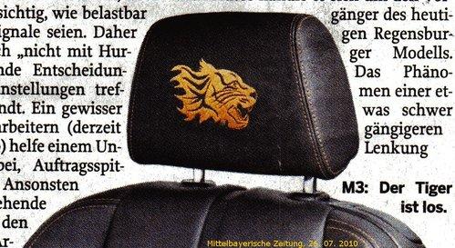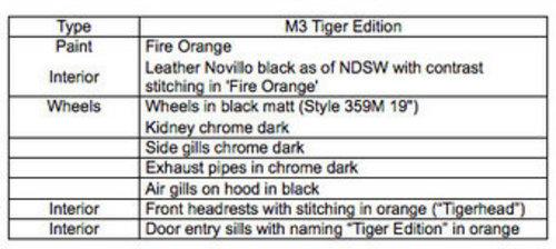 外觀方面,M3 Tiger特別版的進氣格柵、反光鏡邊緣都使用了黑色,而車輪部分也升級為寶馬的359M系列(16輻)運動化鍛造黑色19英寸輪轂,配合銀色的鍍鉻排氣管。內(nèi)飾部分,M3 Tiger紀(jì)念版的內(nèi)飾為黑色真皮坐椅,對應(yīng)火焰橙的走線。