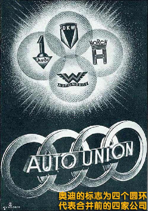 這四家公司對當(dāng)時(shí)德國汽車工業(yè)的進(jìn)步做出了杰出的貢獻(xiàn)。這四家汽車公司于1932年合并為汽車聯(lián)盟股份公司(auto union ag)。從汽車產(chǎn)量來說,汽車聯(lián)盟是當(dāng)時(shí)德國第二大汽車制造公司,商品標(biāo)志為四個(gè)連接的圓環(huán),代表參與合并的四家汽車公司。世界上也就首次出現(xiàn)了四環(huán)標(biāo)志。