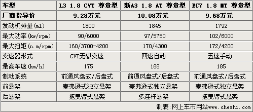 帝豪EC7的最大功率高于其他兩款車型,并且配備了五速手動(dòng)變速箱,能擁有185km/h的最高車速是比較正常的。相對(duì)而言,奇瑞A3的動(dòng)力優(yōu)勢(shì)并不明顯,再配備四速自動(dòng)變速箱,動(dòng)力和經(jīng)濟(jì)性也明顯不如其他兩款車型。比亞迪L3的發(fā)動(dòng)機(jī)雖然功率比較小,但CVT無(wú)級(jí)變速箱給這款車加分不少,而且通風(fēng)盤(pán)式制動(dòng)也不遜于其他產(chǎn)品。