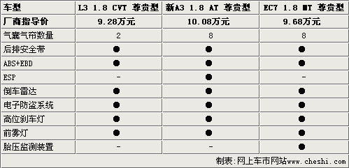 另外,奇瑞新A3全系都標配了ESP電子穩(wěn)定系統(tǒng),緊急情況下可以大大提高整車的安全性,在主動安全方面更加優(yōu)秀。另外,帝豪EC7系列車型都配備了胎壓監(jiān)測裝置,這種配置在炎炎夏日或者出游的時候非常實用。相對而言,比亞迪L3雖然是全新車型,但在安全配置方面確實沒有太多亮點可言。