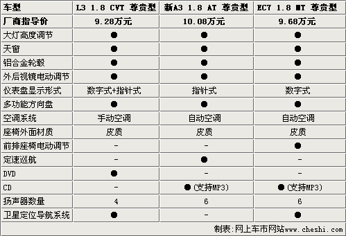 奇瑞新A3和帝豪EC7都采用自動空調(diào),而比亞迪L3卻依然采用手動機械式空調(diào),相對而言有些落伍。奇瑞新A3雖然配備了定速巡航系統(tǒng),在高速駕駛中可以帶來更多的舒適性,但個人認為也帶來一定的安全隱患。比亞迪L3配備了DVD系統(tǒng),和帝豪EC7一樣都配備了GPS導航功能。奇瑞新A3配備支持MP3、WMA音頻格式的CD音響,與帝豪EC7一樣都配備6聲道音響系統(tǒng),比比亞迪L3的音響效果應該更出色。
