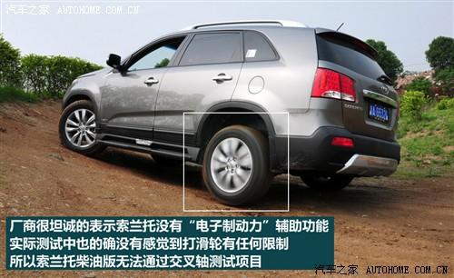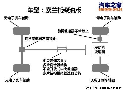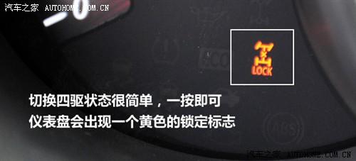 按動(dòng)中控臺(tái)上的四驅(qū)按鍵即可切換至四驅(qū)模式,索蘭托采用中央多片離合器的四驅(qū)結(jié)構(gòu),前后橋差速器均不帶有鎖止功能,并且沒(méi)有電子制動(dòng)輔助,因此想通過(guò)交叉軸是不可能的,所以在進(jìn)行淺度越野時(shí)應(yīng)該優(yōu)化路線避免出現(xiàn)交叉軸的情況。