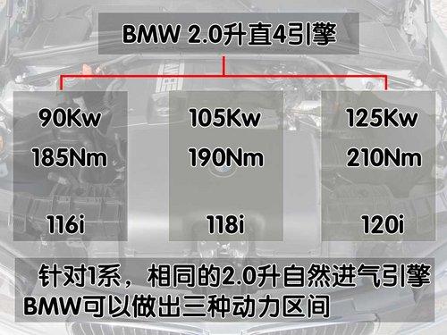 在歐洲市場BMW旗下的1系轎車在2.0升排量這個級別內(nèi),擁有3款細分車型,分別是116、118和120。而其他排量的車型還包括130以及120的柴油車款,目前中國市場所銷售的1系為120和130兩個款式。很難想象一款2.0升級別的自然進氣引擎被BMW弄出了那么多種“花樣”,在歐洲市場就有從90千瓦/185牛米、105千瓦/190牛米到125千瓦210牛米的3種車款。其中90千瓦/185牛米的入門車款被命名為116i屬于BMW 1系當(dāng)中價位最低的車款。