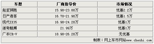 五款車型除了價格一直堅挺的CR-V以外,都有一定程度的價格優(yōu)惠,而且全部過萬。這樣的營銷手段,對于本就十分火爆的SUV市場定會造成不小沖擊。從1萬到2.2萬的價格優(yōu)惠,對于熱銷SUV來說還算厚道,特別是剛剛上市不久的現(xiàn)代IX35,僅上市幾個月就出現(xiàn)了1萬元的價格優(yōu)惠,實屬不易。