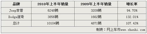 Jeep吉普和Dodge道奇兩大品牌在2010年上半年銷量已經(jīng)超過2009年全年的總銷量。2010年上半年Jeep吉普品牌車型銷量達(dá)6248量,較去年上半年增長了94.7%。