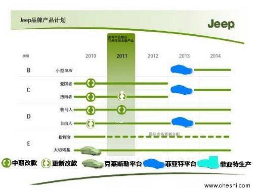 通過Jeep近兩年的產(chǎn)品規(guī)劃圖可以看出,Jeep自由人將于2013年開始使用菲亞特生產(chǎn)平臺前,而且在明年還將推出新款自由人。Jeep牧馬人將于明年推出70周年紀(jì)念版車型,并且一直持續(xù)生產(chǎn)。除Jeep指揮官將于2010年末停產(chǎn)外,Jeep大切諾基將繼續(xù)保持克萊斯勒血統(tǒng)一直生產(chǎn),并且新款大切諾基將于今年年底引入國內(nèi)。