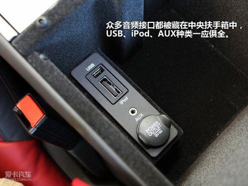 頂棚使用了突顯質(zhì)感的翻毛皮鋪陳,這種材質(zhì)同樣延伸到ABC柱。車內(nèi)大面積采用了帶暗紋的金屬飾條,相信熱衷于駕駛的人肯定會(huì)喜歡這種真皮+金屬的內(nèi)飾氛圍,中控臺(tái)設(shè)計(jì)的比較整潔,中央觸摸屏掌控了大部分功能,中控臺(tái)上只布置了一些常用功能按鍵,在實(shí)際使用過程中比較直觀,沒有難度。眾多音頻接口都被藏在中央扶手箱中,USB、IPOD、AUX種類一應(yīng)俱全。