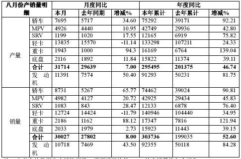 江淮汽車9月6日晚間發(fā)布2010年8月份產(chǎn)銷快報(bào),公司8月份總產(chǎn)量為3.17萬臺(tái),同比增長7%;總銷量為3萬臺(tái),同比增長8%。公司1-8月累計(jì)總產(chǎn)量為29.54萬臺(tái),同比增長46.73%,總銷量為30.37萬臺(tái),同比增長52.6%。