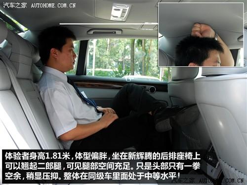 如果你是輝騰的車主那么一定更愿意坐在后排,那么乘坐空間肯定是第一位的,身高181cm的體驗(yàn)者坐在后排腿部的縱向很充裕,但是受到車頂造型的影響頭部空間沒有想象的大有一拳左右,不過這樣的空間表現(xiàn)如果乘客不是過于挑剔應(yīng)該可會滿意。