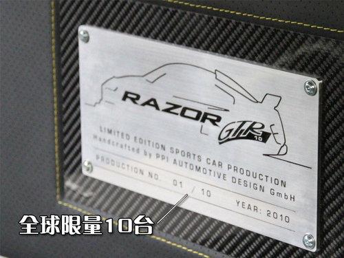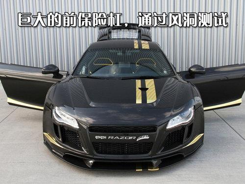 PPI打造的改裝版R8命名為RAZOR GTR-10,這個名字中的10意味只限量改裝10臺。RAZOR GTR-10是一款高性能全碳纖維輕量化超級跑車,前臉換裝了巨大的碳纖維運動前保險杠,完美的運用了空氣動力學并通過了風洞測試。前備箱蓋一側(cè)有兩條金色賽道紋貫穿車身前后。