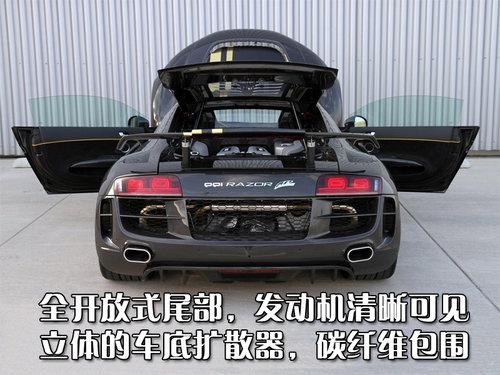 另外,RAZOR GTR-10還裝備了油壓可調(diào)懸掛,當需要時可提高車身45毫米,讓你下地庫不再成為難題。當然這款改裝版R8比普通版售價要高出很多,具體多少請自己想象吧。