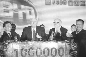 比亞迪總裁王傳福(左一)、巴菲特(右一)等出席比亞迪汽車第100萬輛銷售慶典 上海證券報(bào)傳真圖
