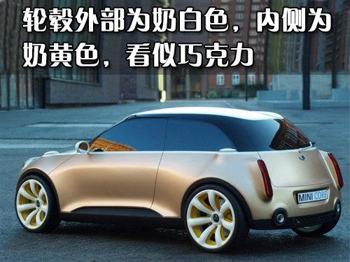 MINI Core概念車(chē)采用內(nèi)凹陷七幅白色輪轂,內(nèi)側(cè)噴涂的是奶黃色,造型非?蓯(ài)就如由巧克力制成一樣。