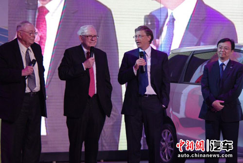 隨著一輛銀色的比亞迪M6緩緩駛上舞臺,巴菲特、王傳福以及比爾·蓋茨、查理·芒格在閃爍的鎂光燈和全場關(guān)注的目光中依次走出M6,笑容可掬的巴菲特甚至朝著M6豎起大拇指。