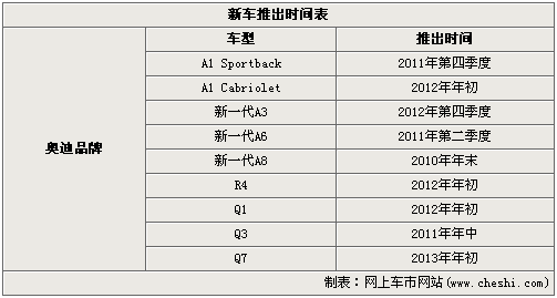 從表中可以清晰的體現(xiàn)出,奧迪品牌在未來的3年內(nèi)將推出近10款車型,其中包括品牌旗下第一款小型車A1,剛剛進國內(nèi)A3下一大產(chǎn)品,全新新一代A6、A8,動感跑車R4,以及SUV車型Q1、Q4以及Q7的換代車型。未來3年將推出的這些車型將為奧迪品牌的下一個“百萬輛”銷量打下堅實基礎。