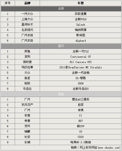 從表中可以看出,在2010年第四季度(10-12月)共有23款新車將于消費(fèi)者見面。合資品牌品牌共有6款車型登場(chǎng),上海大眾的全新POLO和廣汽本田的歌詩(shī)圖是關(guān)注度相對(duì)高的兩款明星車型;進(jìn)口陣營(yíng)中奔馳全新CLS已經(jīng)被炒得非;馃,而售價(jià)低很多的起亞SL-智跑則會(huì)引起共多SUV愛好者的注目;自主幫派以9款新車雄居榜首,第四季度這部分的特點(diǎn)在于有全新的品牌加入戰(zhàn)局,廣汽、東風(fēng)等合資品牌都將下一步的計(jì)劃投身到自主品牌的浪潮之中。