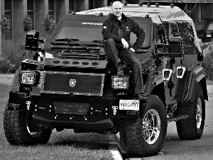加拿大汽車廠商Conquest Vehicles最近推出的一款“騎士掠奪者XV”堪稱世界最強悍的越野車。越野車搭載一臺6.8L V10發(fā)動機,最大功率400馬力,重量超過5噸。該車采用了64毫米的透明防彈玻璃,足以對抗小型便攜式火箭彈的襲擊。該車售價高達48.9萬美元。(宗和)