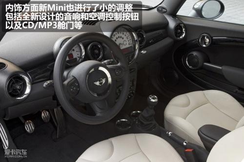 內(nèi)飾方面新MINI也進行了小的調(diào)整,其中包括全新設(shè)計的音響和空調(diào)系統(tǒng)控制按鈕、以及CD/MP3艙門等。配置方面將增加升級版收音機、MP3/CD播放器、AUX接口微型導(dǎo)航儀、彩色行車電腦顯示器、藍牙和USB音頻接口等。