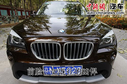 了解了X1的尺寸后,我們再來近距離觀察它的外觀和細節(jié)。X1正面巨大的雙腎進氣格柵,上揚的天使眼大燈以及保險杠下部的銀色涂裝所傳達出來的仍然是寶馬一如既往的兇悍,機艙蓋上的棱線凸顯出力量感。