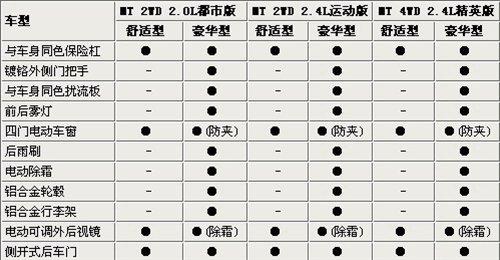 據(jù)悉,北汽域勝007上市以后將分為都市、運(yùn)動(dòng)、精英三個(gè)版本、每個(gè)版本車型又細(xì)分為舒適、豪華兩種規(guī)格。其中,頂配版車型將采用電動(dòng)分時(shí)四驅(qū),低配版車型采用前置后驅(qū),變速器則全系均為5速手動(dòng)。