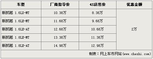 據(jù)4S店銷售人員介紹,新凱越分為1.6L與1.8L兩種排量車型,目前新凱越的1.6L全系優(yōu)惠2萬元,較上個(gè)月的優(yōu)惠降幅有所回縮。經(jīng)優(yōu)惠后,全系最低配的1.6LX-MT車型售價(jià)回升到了8.38萬元。經(jīng)優(yōu)惠后,1.8L手動(dòng)和自動(dòng)兩款車型售價(jià)也回升到了11.38萬元和12.98萬元。銷售人員還介紹,目前1.6L車型店內(nèi)無現(xiàn)車,欲購(gòu)買者需交訂金2000元,下個(gè)月才可提車。