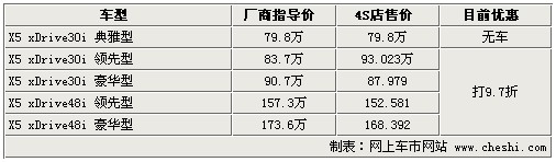 據(jù)4S店銷售人員介紹:目前寶馬X5除3.0升典雅型無車外,其它車型可打9.7折,最大優(yōu)惠達(dá)5.2萬元之多。但是目前X5無現(xiàn)車,預(yù)定最短需等一個(gè)半月,4.8升車型最長需等半年。雖然目前X5優(yōu)惠幅度較之前有所縮水,但目前無現(xiàn)車的狀態(tài)能有小幅優(yōu)惠也算是一個(gè)小的驚喜。