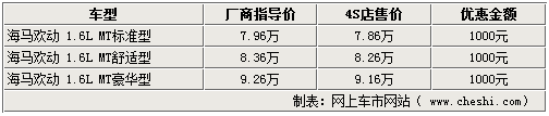 海馬歡動(dòng)1.6L系列車型已經(jīng)上市有段時(shí)間了,售價(jià)在7.96萬(wàn)至9.26萬(wàn)之間。網(wǎng)上車市網(wǎng)站由北京地區(qū)經(jīng)銷商處了解到,現(xiàn)在購(gòu)車均有千元的現(xiàn)金優(yōu)惠。另外一款上市時(shí)間較長(zhǎng)的1.8L系列車型 ,全系車型則最高可給出9千元的現(xiàn)金優(yōu)惠。具體詳情如下:
