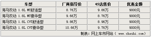 經(jīng)銷商表示,海馬歡動(dòng)1.8L排量車型,最低配的手動(dòng)舒適型售價(jià)8.76萬(wàn),最高配的自動(dòng)(CVT)豪華型售價(jià)10.66萬(wàn),優(yōu)惠金額均為9千元,除現(xiàn)金優(yōu)惠外還會(huì)有相應(yīng)的裝飾贈(zèng)送,F(xiàn)金優(yōu)惠配合購(gòu)置稅優(yōu)惠,則大大減輕了消費(fèi)者的購(gòu)車負(fù)擔(dān)。