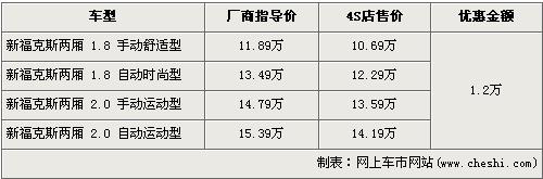 福克斯自06年8月份上市以來,其憑借動感前衛(wèi)的外形以及動力充沛的性能配置博得了不少年輕時尚小齡青年的喜愛,使此車的銷量一直保持的比較穩(wěn)定。上個月網(wǎng)上車市為您帶來了兩廂福克斯全系優(yōu)惠1萬元的行情,近日據(jù)網(wǎng)上車市價格監(jiān)測系統(tǒng)顯示:新福克斯兩廂全系現(xiàn)金優(yōu)惠1.2萬元,具體詳情請看下表:
