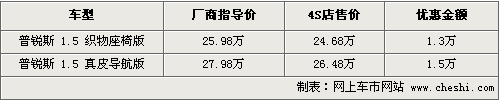 豐田普銳斯是豐田公司開發(fā)的一款混合動力車,是較為成熟的環(huán)保車型,自進入國內(nèi)市場后一直受到消費者的歡迎。普銳斯獨特的環(huán)保科技為后來的混合動力車型提供了借鑒。目前筆者了解到,普銳斯的售價出現(xiàn)了一定幅度的松動,最高可優(yōu)惠現(xiàn)金1.5萬元,具體車型以及價格如下列表: